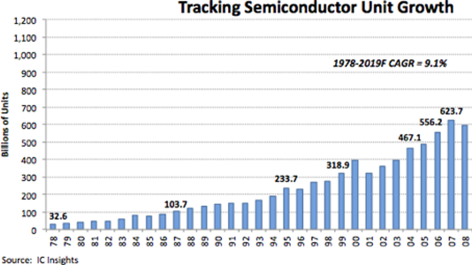 Ежегодные поставки полупроводниковых приборов за год выросли на 10% и достигли 1,0682 трлн единиц. Аналитики ожидают, что в 2019 году рост составит 7%, так что за год будет отгружено 1,1426 трлн единиц указанной продукции. Для сравнения: в 1978 году объем поставок был равен 32,6 млрд единиц. То есть совокупный годовой темп роста за 40 лет годы составил около 9,1%, что является очень высоким показателем. Наглядное представление о развитии отрасли дает график.