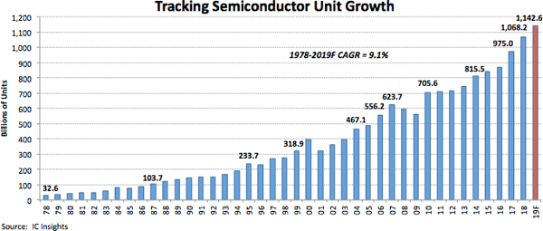 Ежегодные поставки полупроводниковых приборов за год выросли на 10% и достигли 1,0682 трлн единиц. Аналитики ожидают, что в 2019 году рост составит 7%, так что за год будет отгружено 1,1426 трлн единиц указанной продукции. Для сравнения: в 1978 году объем поставок был равен 32,6 млрд единиц. То есть совокупный годовой темп роста за 40 лет годы составил около 9,1%, что является очень высоким показателем. Наглядное представление о развитии отрасли дает график.