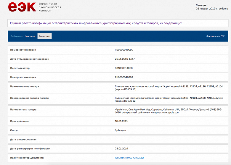 Компания Apple зарегистрировала семь обновлённых моделей планшетов iPad в базе данных Евразийской экономической комиссии. Получение такой сертификации даёт право на продажу устройств с шифрованием в Армении, Белоруссии, Казахстане, Киргизии и России.