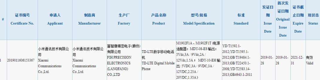 В базе данных китайского регулятора 3C появилась запись, относящаяся к новому, еще не представленному официально смартфону Xiaomi. Аппарат фигурирует под обозначением M1902F1, но под этим индексом с большой долей вероятности скрывается серийная модель Mi 9.