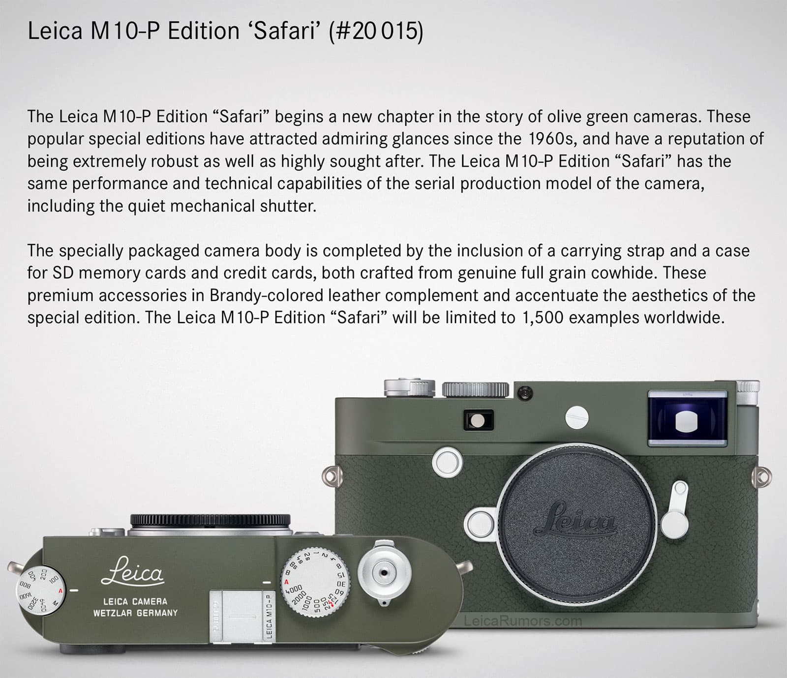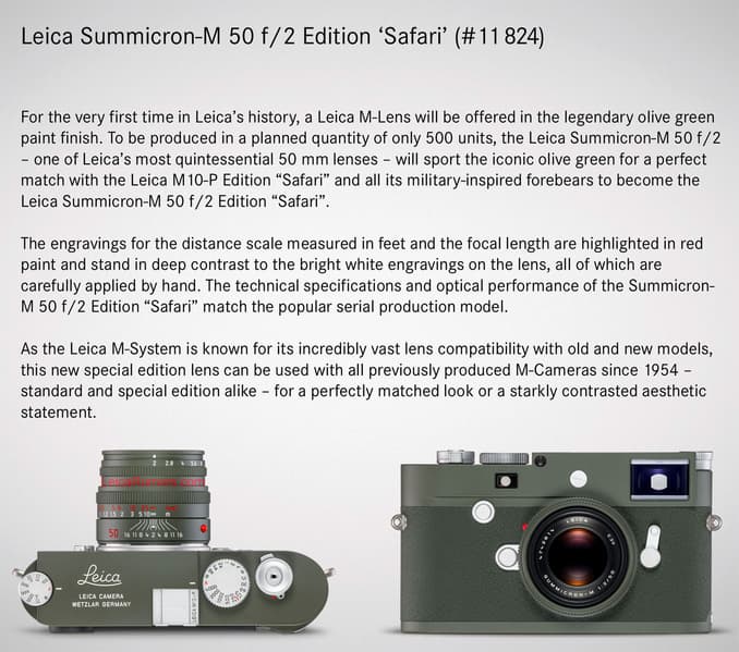 Источник опубликовал новые сведения о камере Leica M10-P Safari, первое изображение которой появилось в середине месяца. Напомним, это «особое издание» камеры, отличающееся от базовой модели внешним оформлением. Оно будет выпущено ограниченной серией из 1500 штук. Столько же будет выпущено объективов Leica Summicron-M 50mm f/2 ASPH в соответствующем оформлении. Однако если раньше предполагалось, что изделия будут предложены в виде наборов, то теперь источник утверждает, что камера Leica M10-P Safari (#20015) и подходящий в ней по оформлению объектив Leica Summicron-M 50mm f/2 ASPH (#11824) будут продаваться отдельно.