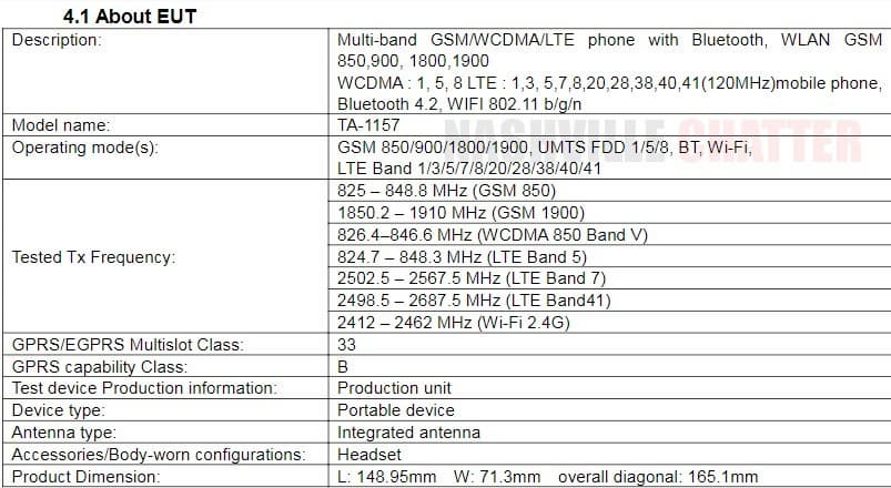 TA-1157 получит сдвоенную основную камеру и сканер отпечатков пальцев под ней. Также в перечне характеристик аккумуляторная батарея емкостью 3000 мА·ч, адаптеры NFC, Bluetooth 4.2 и Wi-Fi 802.11 b/g/n.