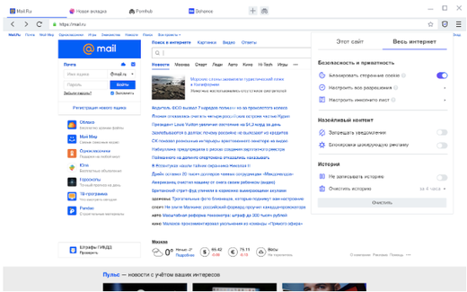 В браузере предусмотрена специальная панель для управления безопасностью. Она доступна в один клик из основного окна браузера. Панель показывает, какие разрешения выданы сайту. Можно быстро изменить настройки для конкретного ресурса или для всего интернета — запретить получение доступа к камере и микрофону, записывать куки, и так далее. В один клик доступна блокировка навязчивой рекламы и предложений о подписке на уведомления.