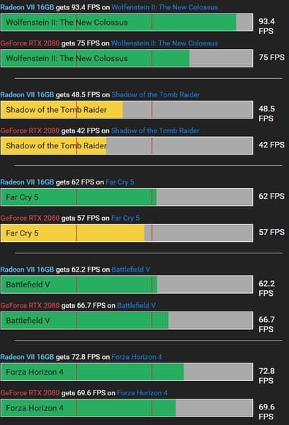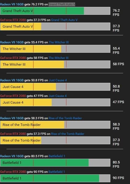 Если точнее, всего карты были протестированы в 21 игре. Из них в 12 играх у адаптеров примерный паритет с незначительным преимущество то одной, то другой карты. В двух играх RTX 2080 существенно опережает конкурента, а вот в остальных семи Radeon VII является безусловным лидером. Если послезавтра тесты различных тематических ресурсов покажут примерно такую же картину, у Radeon VII явно есть шанс найти своего покупателя, несмотря на ощутимо большее энергопотребление и отсутствие аппаратного ускорения трассировки лучей.