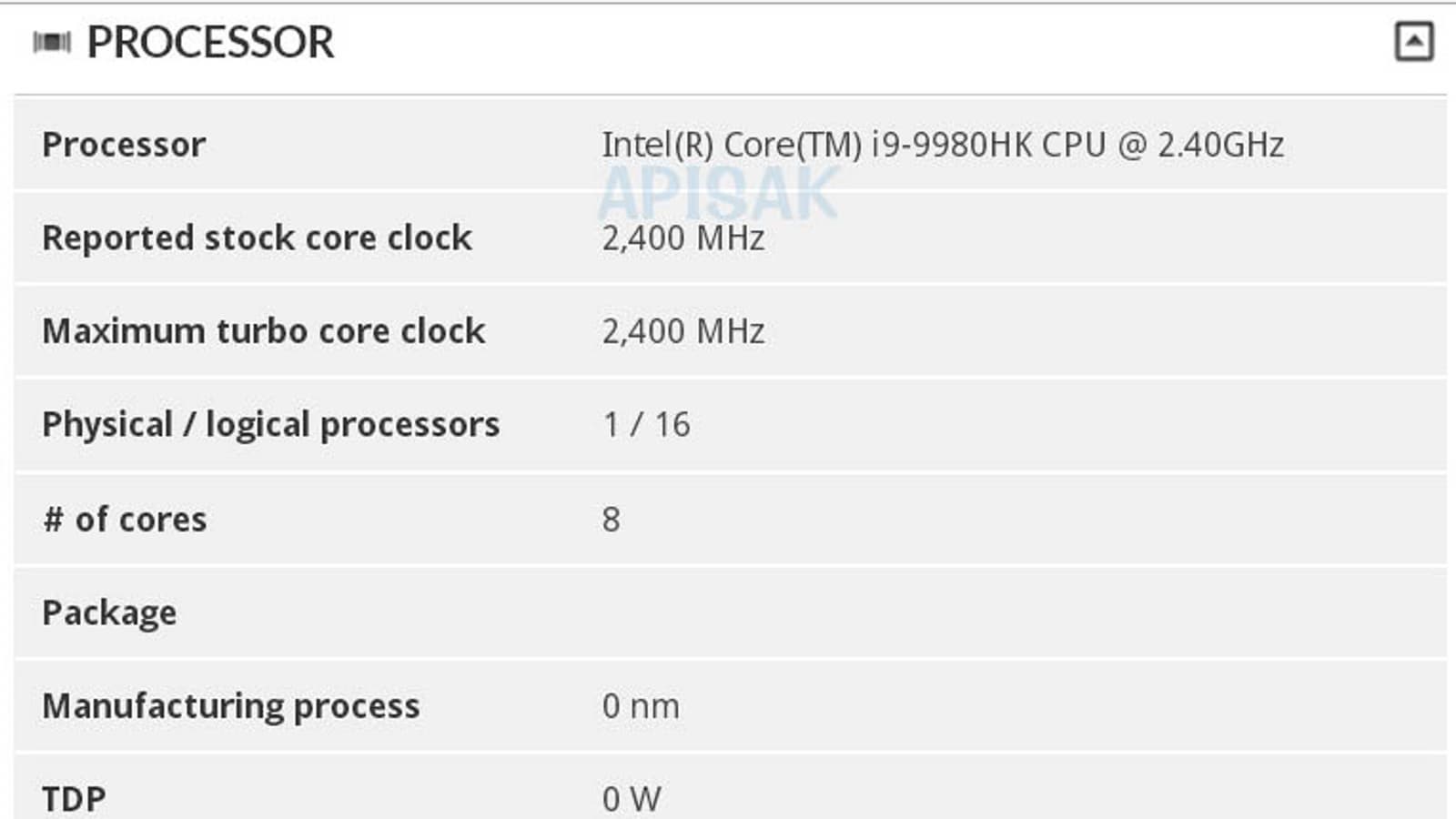 ПО указывает на базовую частоту процессора в 2,4 ГГц. Учитывая, что у шестиядерного Core i9-8950HK показатель равен 2,9 ГГц, это видится вполне возможным. А вот максимальная частота может быть столь же высокой, так как она характерна лишь для условий, когда загружено одно либо два ядра. Правда, ПО и максимальную указывает равной 2,4 ГГц, так что этот показатель может вообще не иметь ничего общего с действительностью.