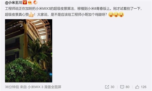 По словам топ-менеджера, сейчас ночной режим для Xiaomi Mi 8 Lite находится в разработке и использует тот же алгоритм, что и Xiaomi Mi Mix 3. В качестве подтверждения он приложил фото, сделанное на смартфон.