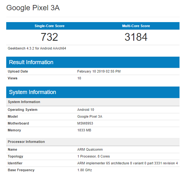 В базе данных популярного тестового пакета Geekbench появились несколько записей о новом смартфоне под названием Google Pixel 3A.