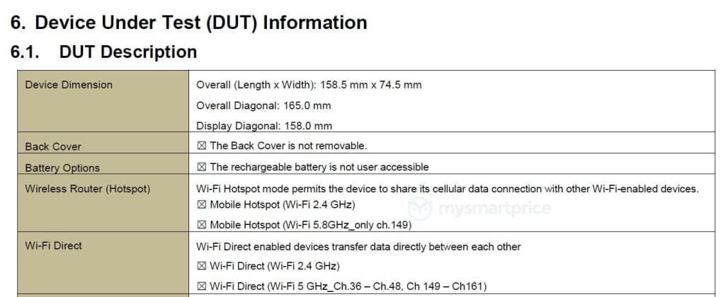 По данным FCC, длина и ширина смартфона составляют, соответственно 158,5 и 74,5 мм. Диагональ корпуса — 165 мм, а диагональ самого экрана — 158 мм или 6,22 в дюймах. Таким образом, смартфон получит экран AMOLED диагональю 6,22 дюйма. Также в документах FCC отмечается, что смартфон поддерживает Wi-Fi 802.11ac и Bluetooth 5.0. Смартфон будет поставляться с зарядным блоком EP-TA200 мощностью 15 Вт.