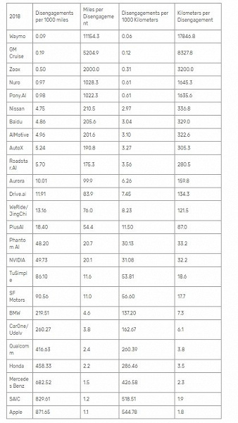 Что интересно, в подобных отчётах впервые засветилась Apple, которая уже какое-то время тестирует свои технологии в США. Её показатель — 1,8 км на одно вмешательство, что является худшим показателем в списке.