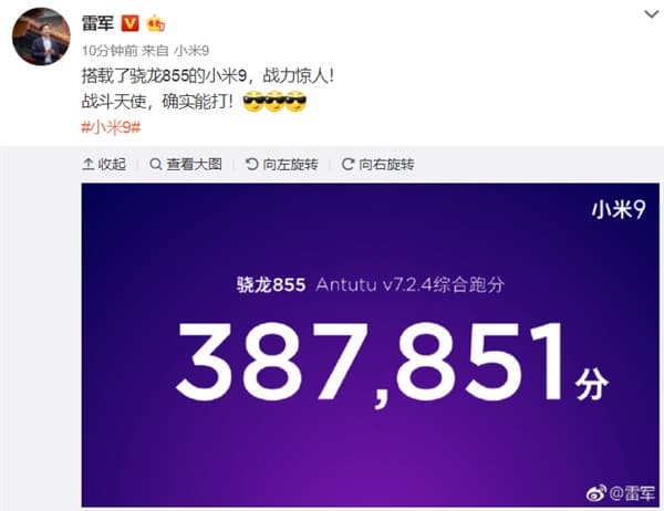 После анонса однокристальной платформы Qulacomm Snapdragon 855 стало понятно, что именно смартфоны на ее базе в скором времени возглавят рейтинги различных бенчмарков. Так, в общем-то, и случилось: в конце января Lenovo Z5 Pro GT, построенный на Snapdragon 855, установил абсолютный рекорд производительности AnTuTu, набрав в бенчмарке 371 273 балла. Да, сделал он это не с первой попытки, да, засчитана была лучшая, но тем не менее. И вот сейчас глава Xiaomi опубликовал в социальной сети Weibo скриншот из презентации флагмана Mi 9 с производительностью в AnTuTu. Судя по баллам, у нас новый претендент на звание абсолютного лидера.