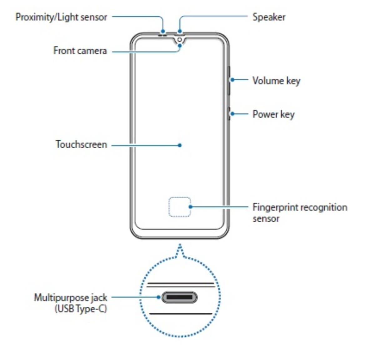 Как можно увидеть, верхняя кромка экрана очень тонкая, чего нельзя сказать о «подбородке». Соотношение площади экрана к передней панели у смартфона будет сравнимо с прошлым поколением моделей Galaxy A. Руководство также подтвердило наличие разъёма для наушников 3,5 мм, тройной основной камеры, подэкранного дактилоскопического датчика, порта USB Type-C и поддержки NFC.