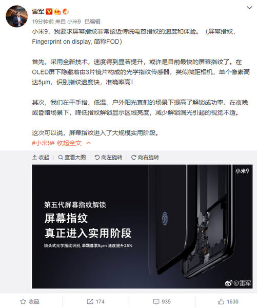 Глава Xiaomi Лей Цзунь (Lei Jun) продолжает раскрывать особенности флагманского смартфона Xiaomi Mi 9. На этот раз речь зашла о подэкранном сканере отпечатков пальцев.