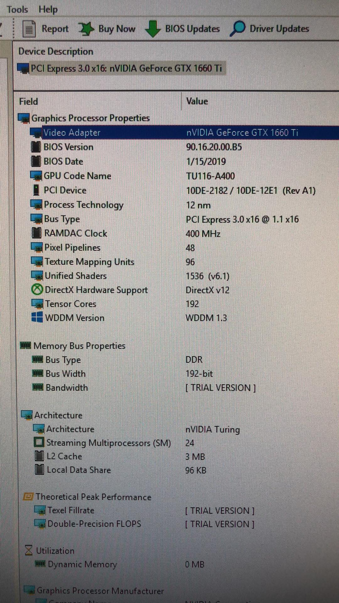 Что касается параметров, ПО Aida64 уже знает о существовании такой модели и верно её определяет. Оно подтверждает информацию о 1536 ядрах CUDA, 192-разрядной шине и 12-нанометровом GPU TU116. Также можно видеть, что графическое ядро содержит 96 текстурных блоков и 192 тензорных ядер, что весьма занятно. Ранее считалось, что младшие карты Turing не получат ни ядер RT, ни тензорных.