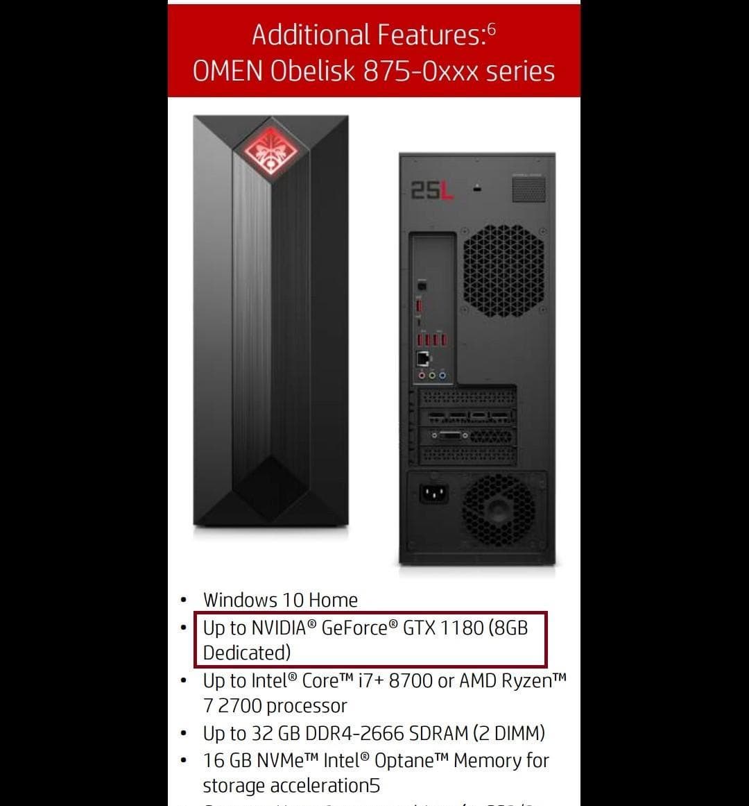Видеокарта GTX 1180, похоже, всё же выйдет. Её упоминание нашли в спецификациях готового ПК Omen Obelisk. Параметров нет, но есть указание на 8 ГБ памяти.