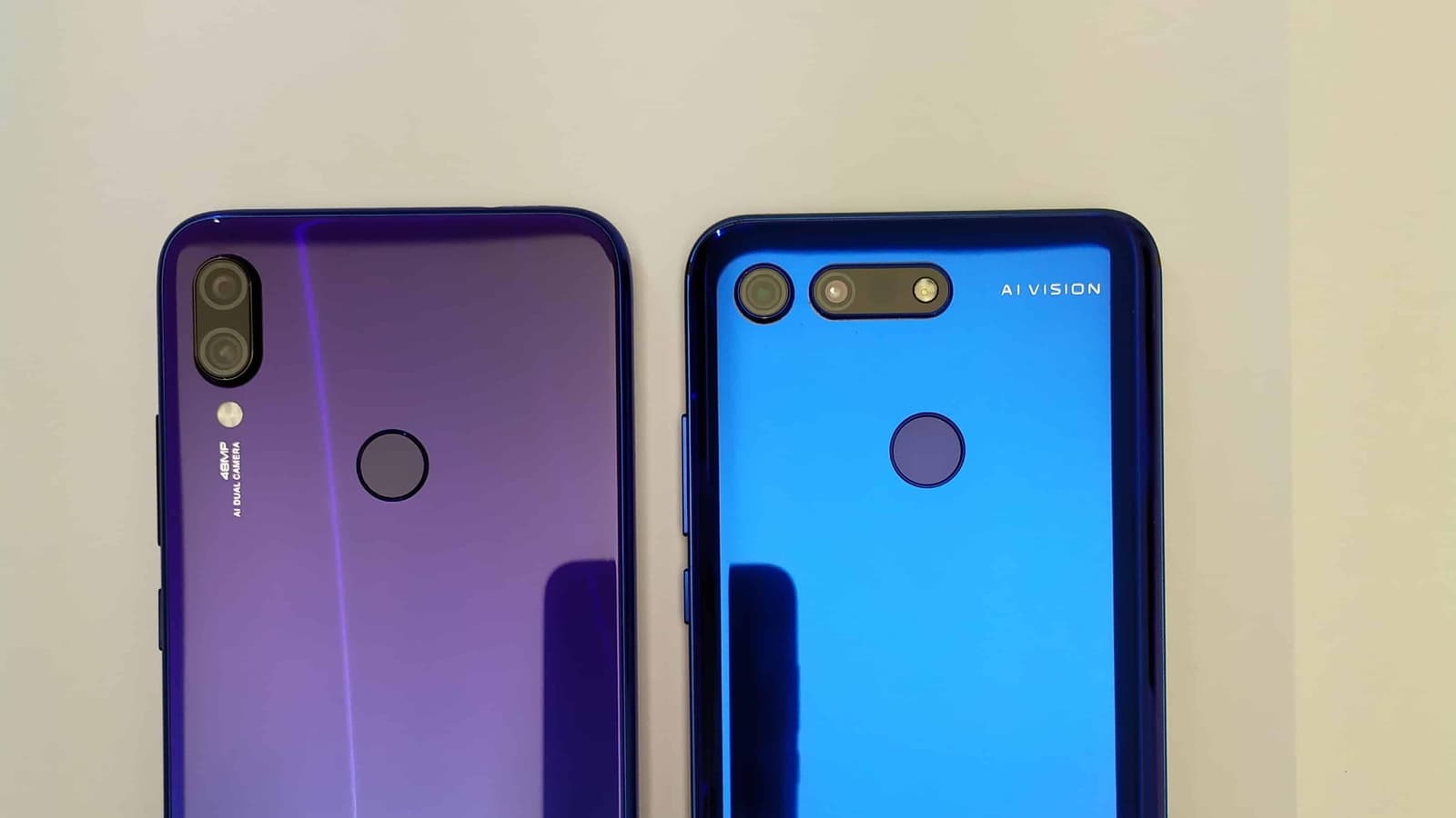 На фото смартфон Redmi Note 7 Pro размещён слева, а справа для сравнения расположен Honor V20. Он представлен в градиентном сине-сиреневом цветовом решении. Видны двойная 48-мегапиксельная камера и дактилоскопический датчик на задней панели.