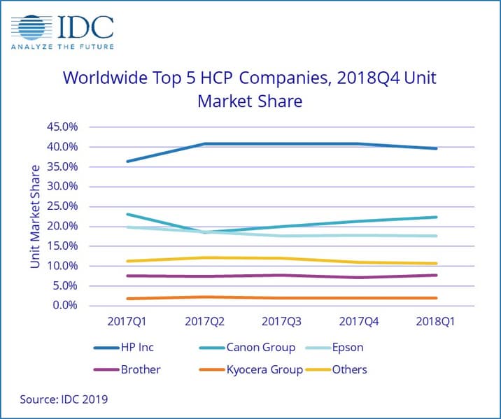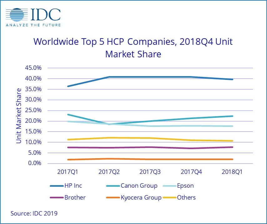 Если рассматривать распределение рынка в целом за год, список выглядит точно так же, но доли HP, Canon, Epson, Brother и Kyocera оказываются равными 40,5%, 20,6%, 17,9%, 7,6% и 2,0% соответственно.