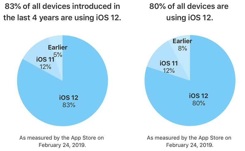 Поэтому неудивительно, что iOS 12 распространяется быстрее iOS 11. На сегодняшний день 83% совместимых устройств и 80% всех устройств с iOS работают на свежей версии системы. Если говорить о совместимых, ещё 12% пользователей предпочитают оставаться на iOS 11, а 5% пользователей и вовсе предпочитают более ранние версии.