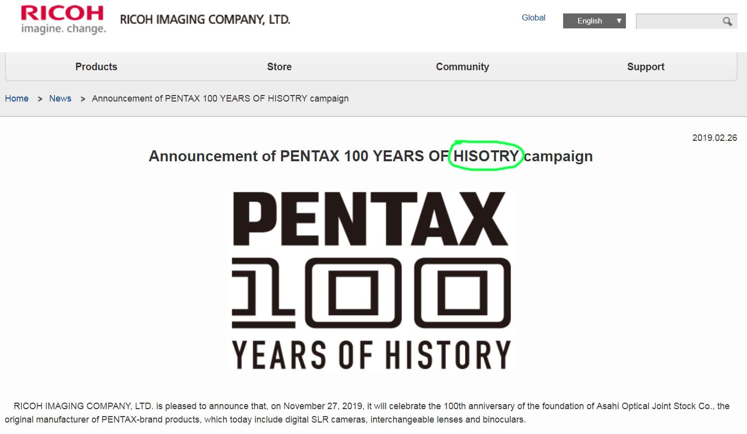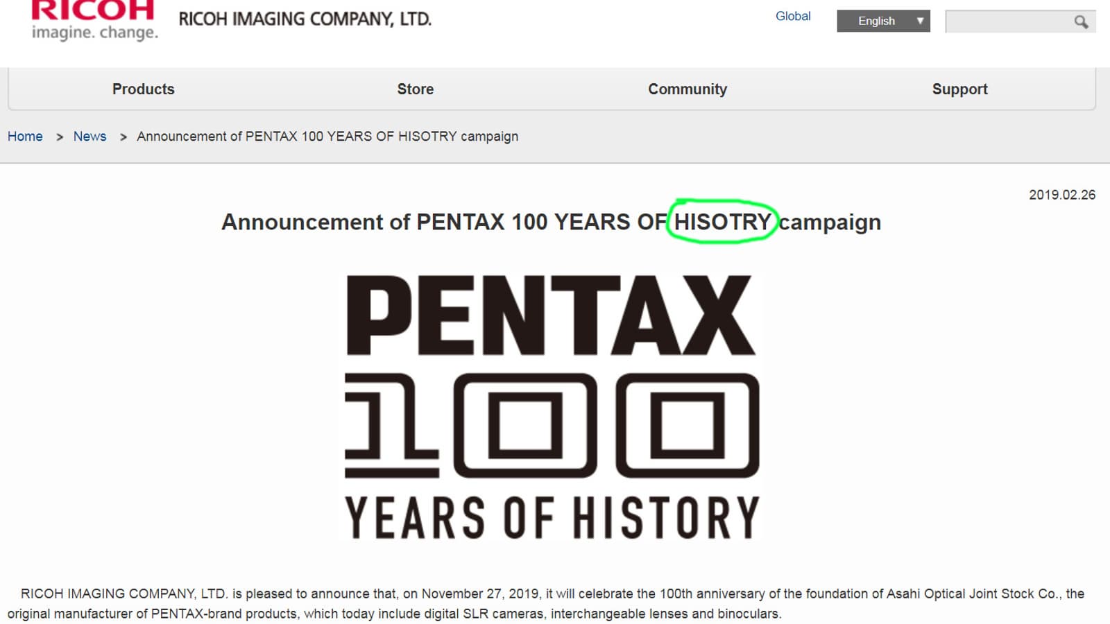 Забавно, что в заголовке пресс-релиза, посвященного празднованию 100-летию марки Pentax, допущена опечатка, которые так любят подмечать в новостях наши читатели.