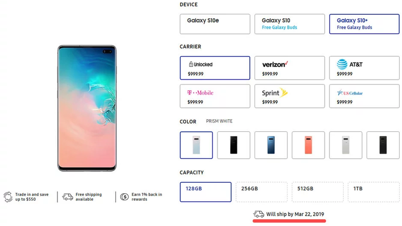 На официальном сайте Samsung указано, что смартфоны Galaxy S10 и Galaxy S10+, оснащенные 128 ГБ флэш-памяти, будут выпущены только 15 или 22 марта, в зависимости от выбранного вами цвета. Samsung не уточняет, какие цвета появятся в продаже раньше и ожидается ли дальнейшая задержка при увеличении объема предварительных заказов.
