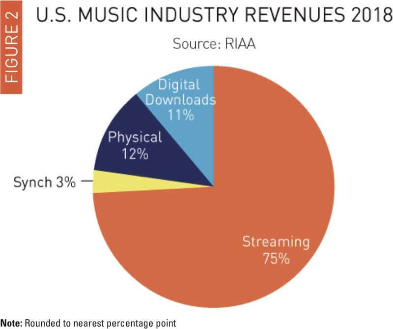 Доля сервисов, которые продают композиции в цифровом виде, вроде iTunes, в 2018 году составила 11% Всего 12% оборота было сгенерировано на продаже песен и музыки на физических носителях.