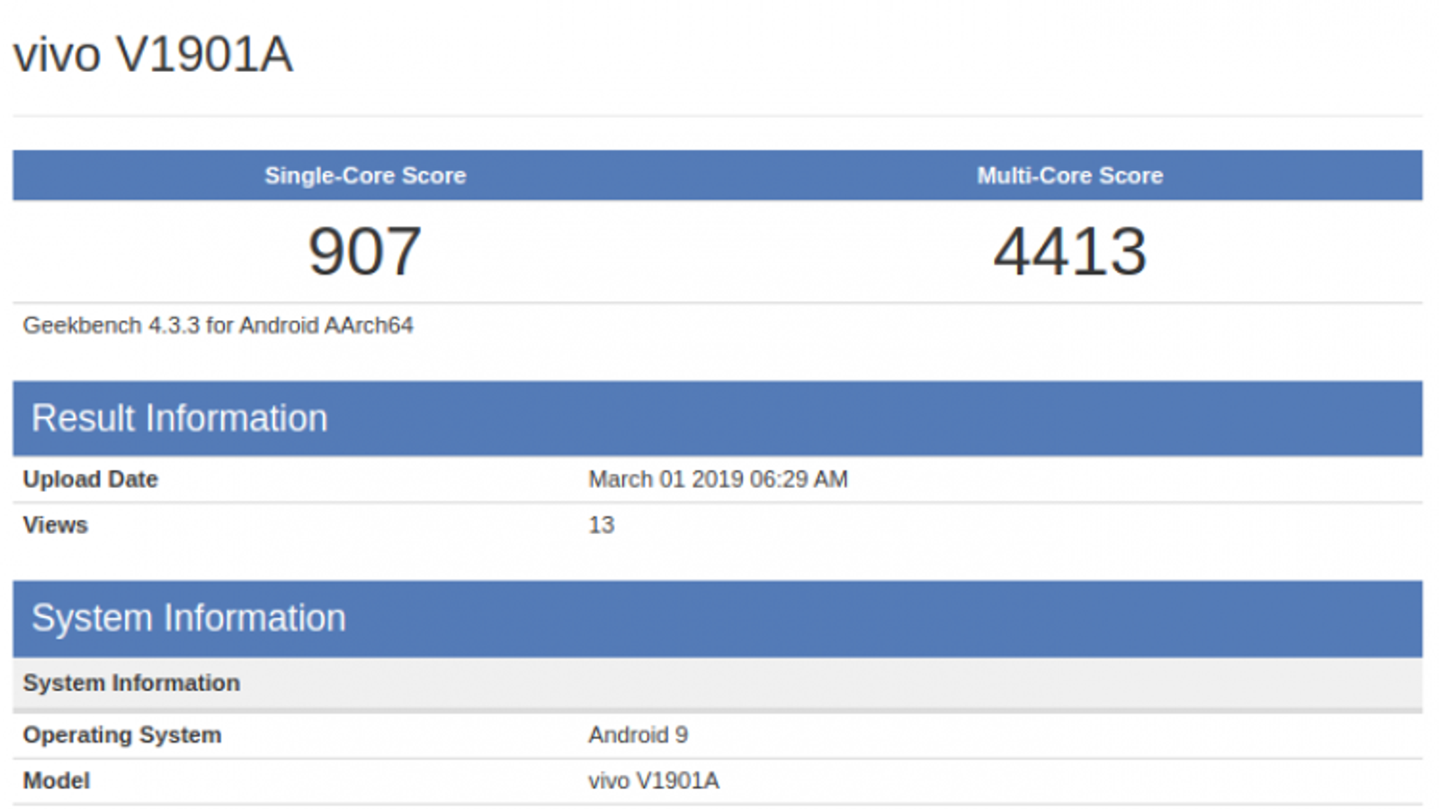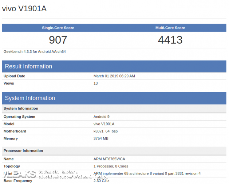В базе данных популярного тестового пакета Geekbench появились несколько записей о новом устройстве, которое проходит под модельным номером Vivo V1901A.