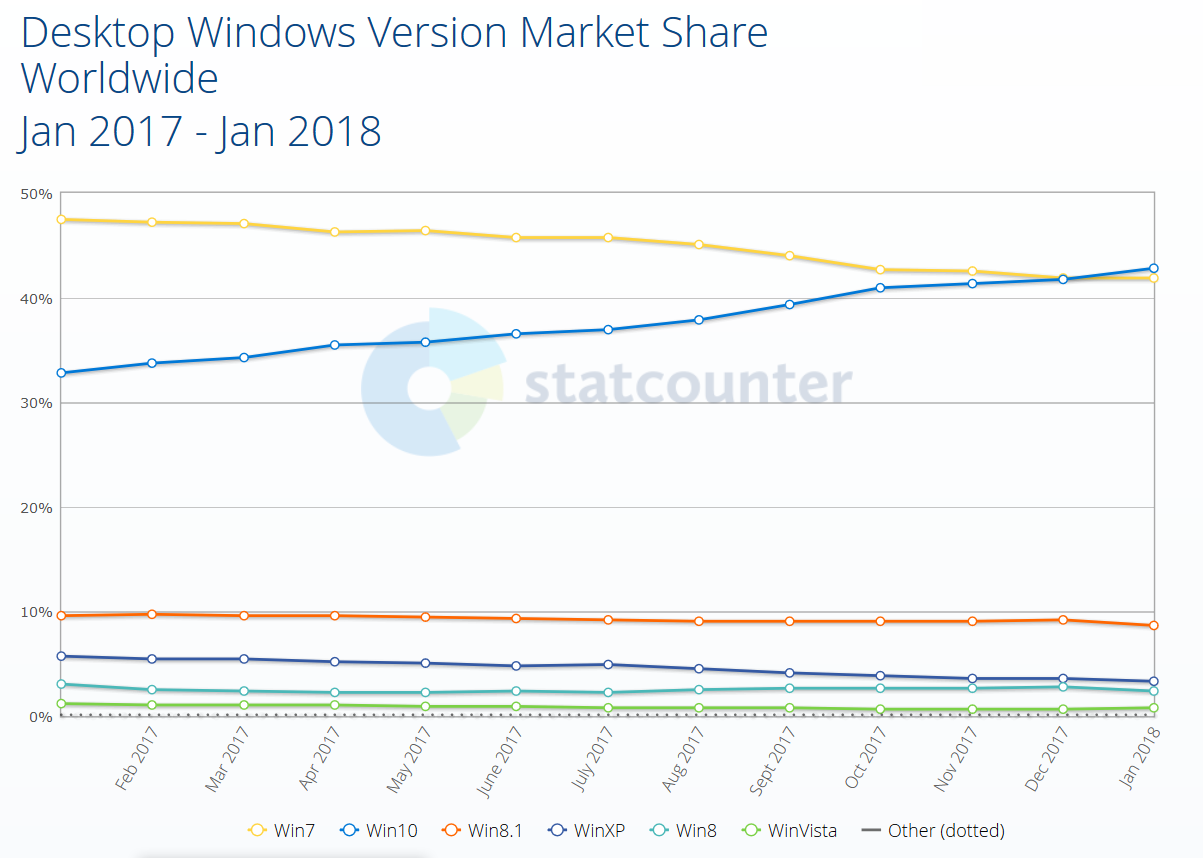 Это вполне закономерное развитие событий, так как случаи регионального превосходства Windows 10 над Windows 7 фиксировалось уже давно. К примеру, в Великобритании это случилось еще в июне 2016 года, а в США – в январе 2017 года.