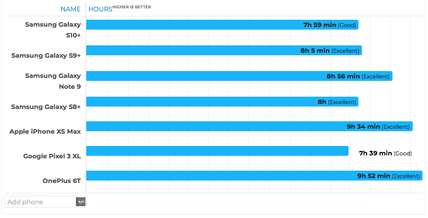 Как оказалось, 4100 мА·ч не так уж и помогли. Смартфон смог проработать 7 часов 59 минут. Это хороший результат, но не фантастический. Особенно, если учесть, что конкурирующие iPhone XS Max и OnePlus 6T, а также прошлогодние Samsung Galaxy S9+ и Galaxy Note9 показали результаты лучше. Что уж говорить, даже Samsung Galaxy S8+ двухлетней давности обогнал Galaxy S10+, хоть и всего на одну минуту. Результат хуже показал Google Pixel 3 XL.