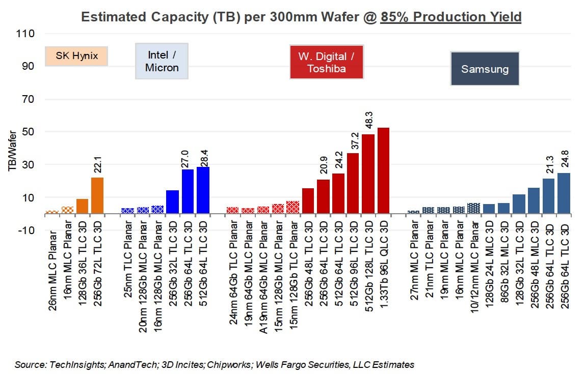 В номенклатуре Toshiba такая память будет называться BiCS-5. Интересно, что микросхема будет относиться к типу TLC (3 бита на ячейку), а не более новому QLC (4 бита на ячейку). Вероятно, производители пока боятся низкого процента выхода годной продукции при выпуске QLC NAND.
