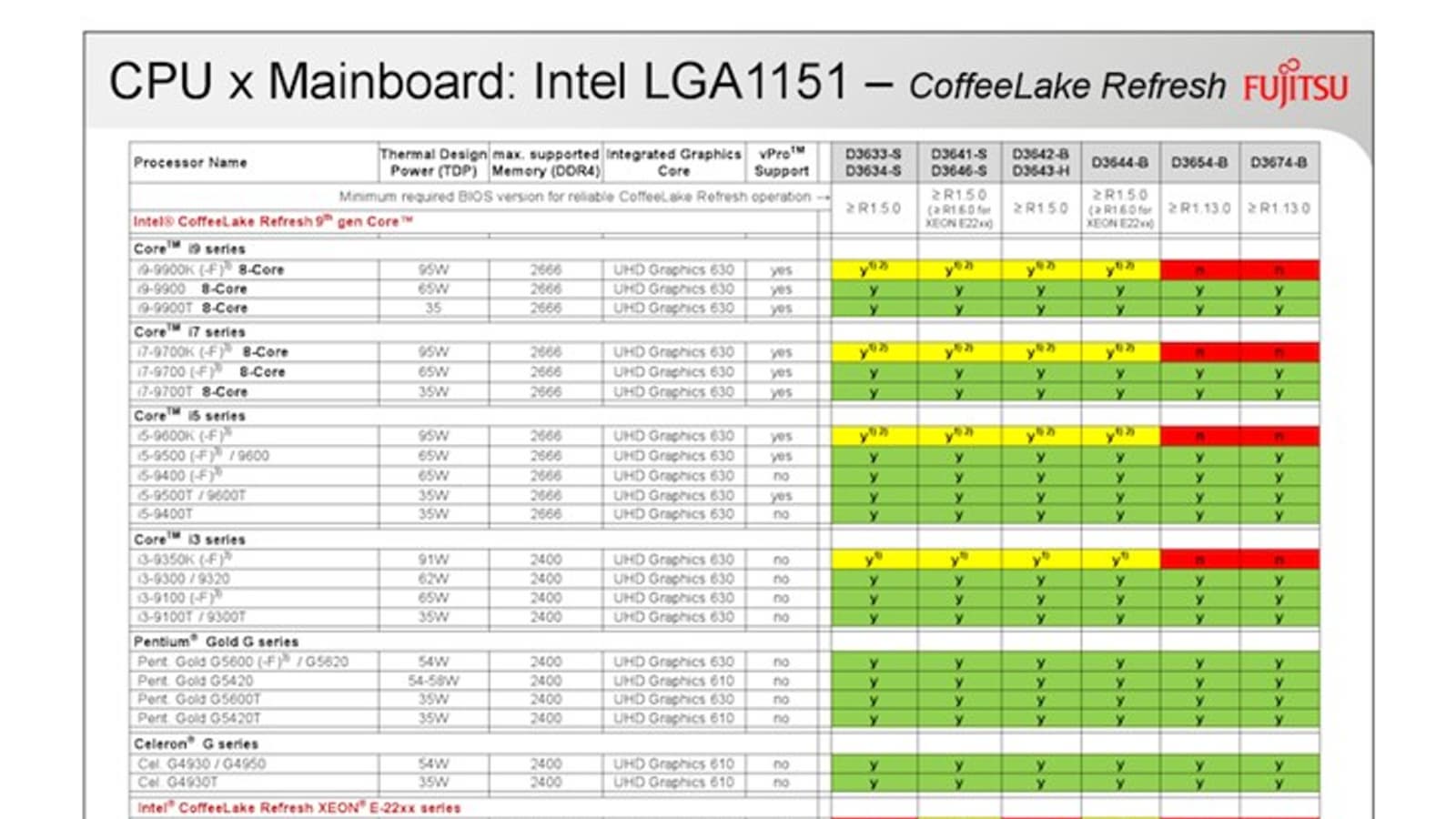 Слухи о том, что Intel готовит восьмиядерный процессор Core i9-9900T, TDP которого составит всего 35 Вт, подтвердились: этот CPU упомянут в документе Fujitsu. А вместе с ним и четыре процессора нового семейства Xeon E-2200.