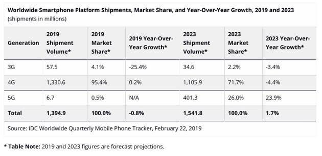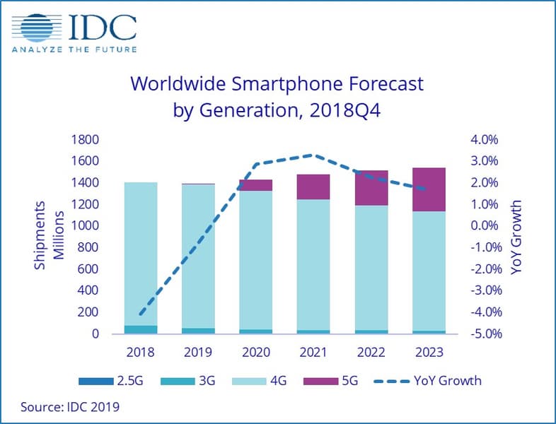 Как прогнозируют аналитики, глобальные мировые поставки смартфонов в 2019 году составят почти 1,4 миллиарда. Из них 6,7 миллиона – модели с поддержкой 5G. Для сравнения, объем поставок моделей с поддержкой лишь 3G будет почти в 10 раз больше.