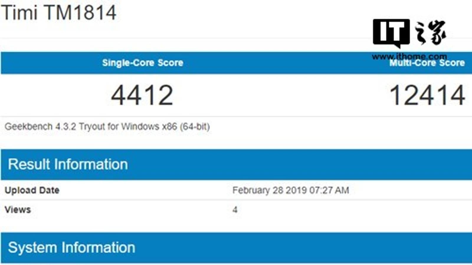 Устройство фигурирует под обозначением Timi TM1814, но источник не сомневается, что под этим обозначением скрывается ноутбук Xiaomi. Аппарат построен на платформе Intel Whiskey Lake-U, оснащен процессором Intel Core i5-8265U (1,6-3,9 ГГц) и 8 ГБ оперативной памяти. В качестве ОС, само собой, выступает Windows 10. В однопоточном тесте ноутбук набрал 4412 баллов, в многопоточном – 12414.