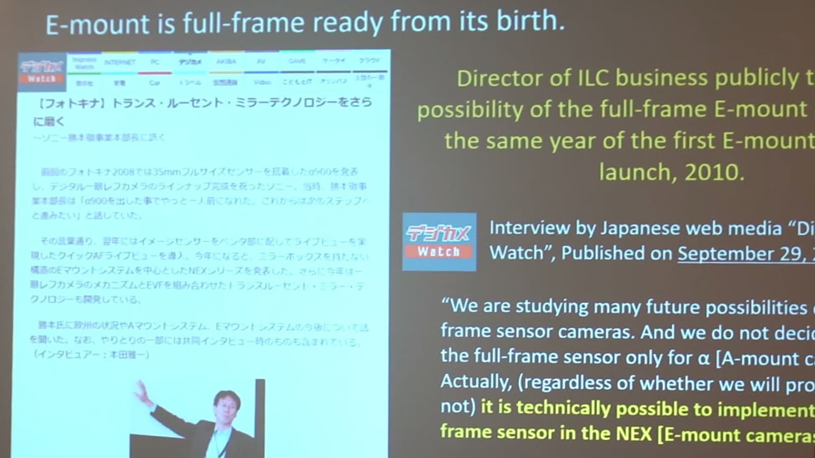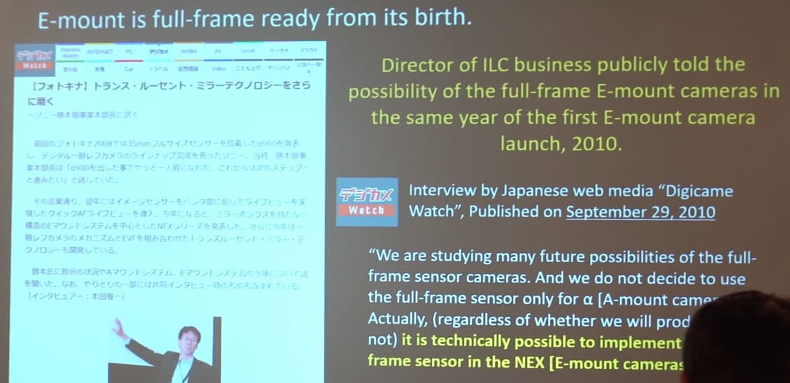Источник опубликовал слайды из недавней пресс-конференции Sony, в ходе которой производитель напомнил, что крепление E изначально было разработано для полнокадровых беззеркальных камер. Хотя первая модель, представленная в 2010 году, была формата APS-C, уже тогда производитель говорил о наличии технической возможности выпуска полнокадровых камер с таким креплением.
