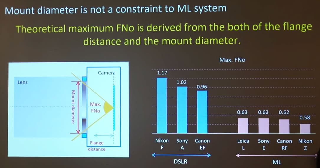 Отметим, что таков же теоретический предел максимальной диафрагмы в случае крепления Leica L, которое договорились использовать в своей продукции компании Leica, Panasonic и Sigma. Крепление Canon RF позволяет теоретически создать объектив с максимальной диафрагмой f/0,62, а недосягаемым рекордсменом по этому параметру является Nikon с креплением Z. Напомним, речь идет о креплениях объективов в полнокадровых беззеркальных камерах.