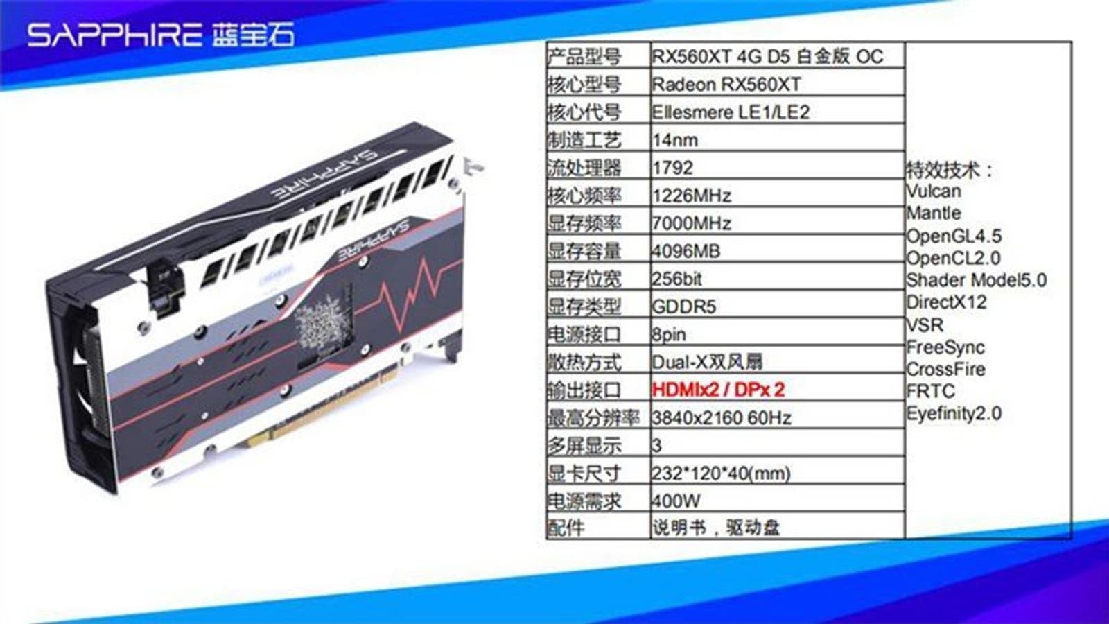 Характеристики видеокарты источник приводит на примере модели Sapphire RX560 XT 4G D5 OC. Она оснащена двумя портами HDMI и двумя DisplayPort, а также фирменной системой охлаждения Dual-X с двумя вентиляторами, несколькими тепловыми трубками и теплораспределительной пластиной. Габариты модели – 232 х 120 х 40 мм.