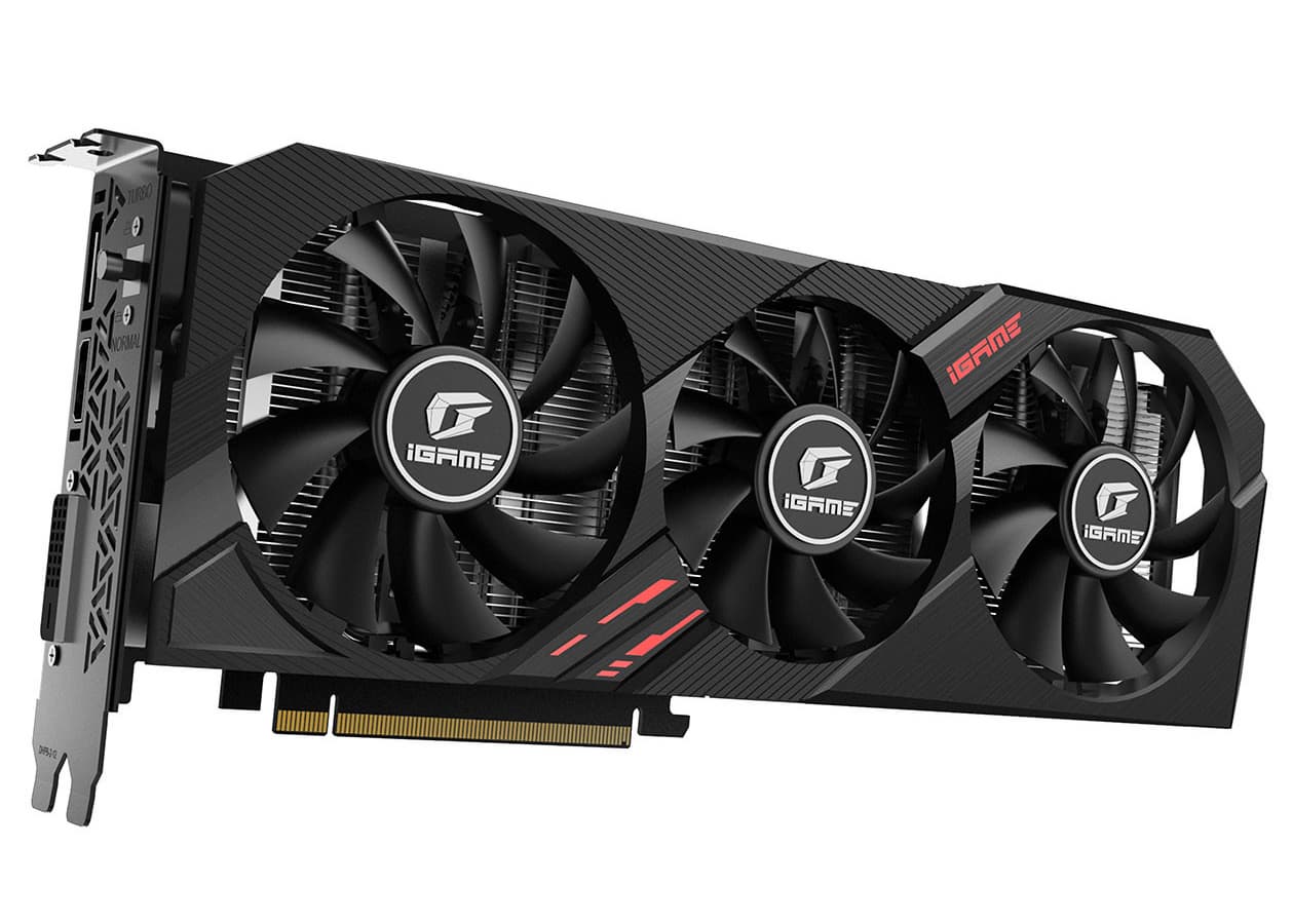 Длина карты — 310 мм. Как можно видеть на фотографиях, охладитель тут огромный, включающий три вентиляторами. Учитывая весьма скромное энергопотребление новой видеокарты Nvidia, можно предположить, что кулер новинки Colorful справится со своей задачей при минимальной скорости вращения вентиляторов.