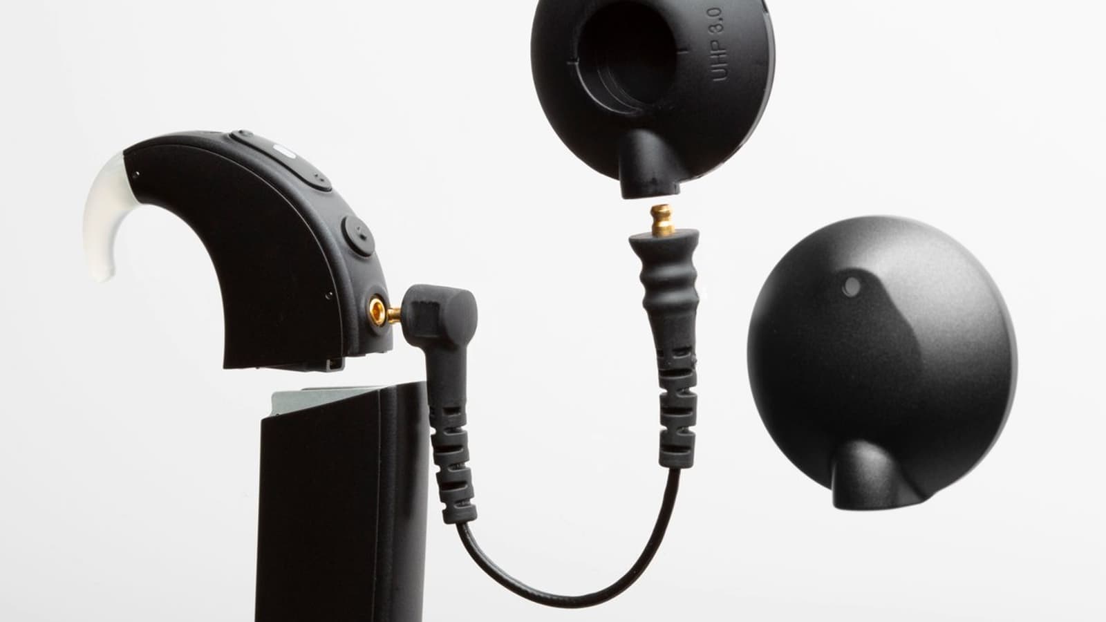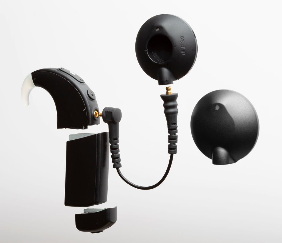 Это беспроводной приемник, разработанный совместно с Phonak, который превращает звуковой процессор Naída CI Q90 в беспроводную гарнитуру Bluetooth. На иллюстрации процессор показан слева вверху. Ниже изображен аккумулятор PowerCel 170, а в самом низу — приемник Naída CI Connect.