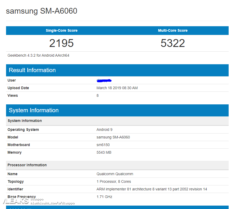 Также появились результаты тестирования Samsung Galaxy A60 в популярном ПО Geekbench, которое подтверждает, что смартфон оснащен однокристальной системой Snapdragon 675 и 6 ГБ оперативной памяти. Из коробки смартфон работает под управлением операционной системы Android 9.0 Pie. Также известно, что аккумулятор имеет емкость 3500 мА•ч.