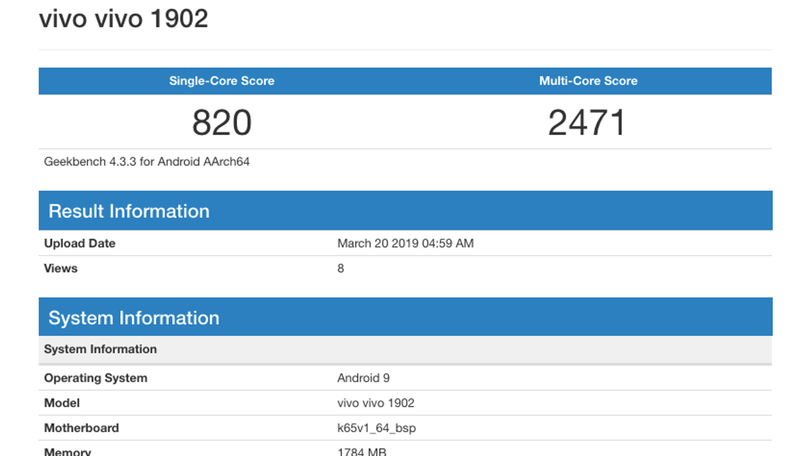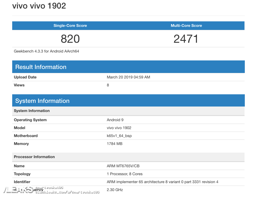 В GeekBench указано, что объем оперативной памяти нового смартфона Vivo составляет 2 ГБ, работает устройство под управлением Android 9.0 Pie.