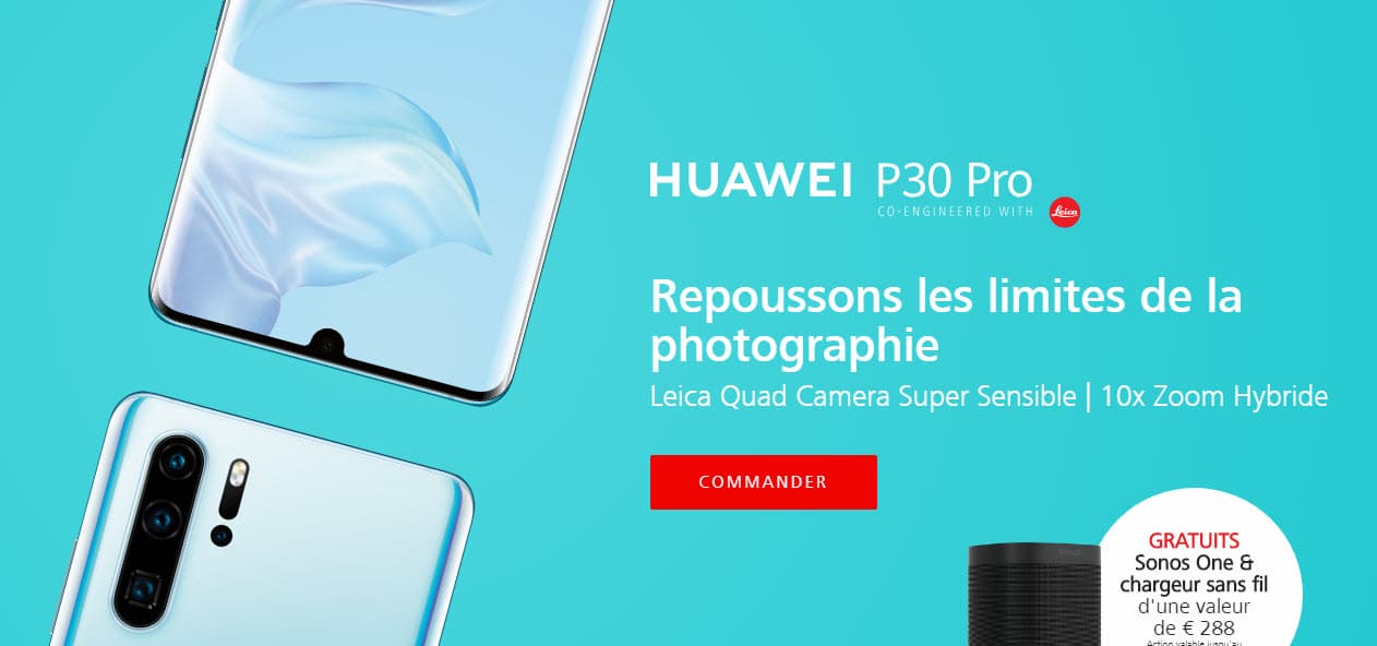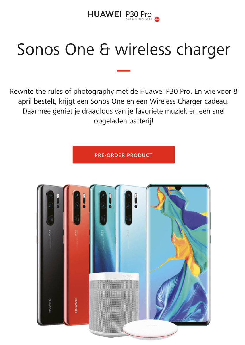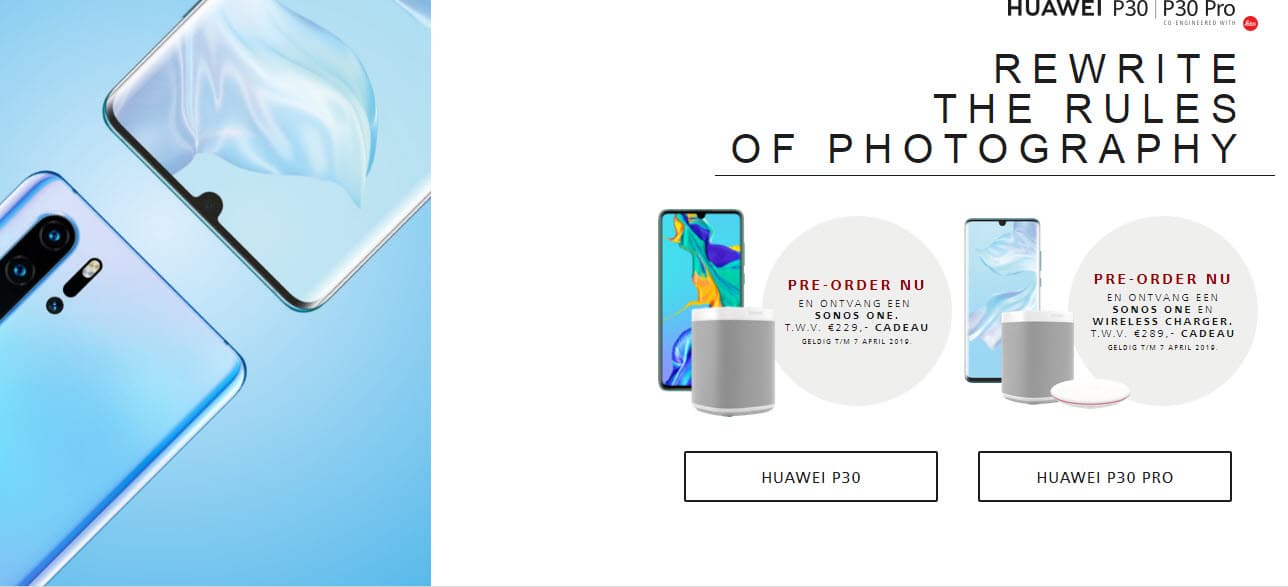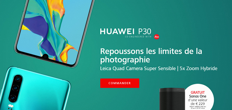 Подтверждена информация о том, что в европейском регионе покупатели P30 получат в качестве бонуса при оформлении предварительного заказа беспроводную колонку Sonos, а за предзаказ Huawei P30 Pro полагается такая колонка и беспроводная зарядная станция.