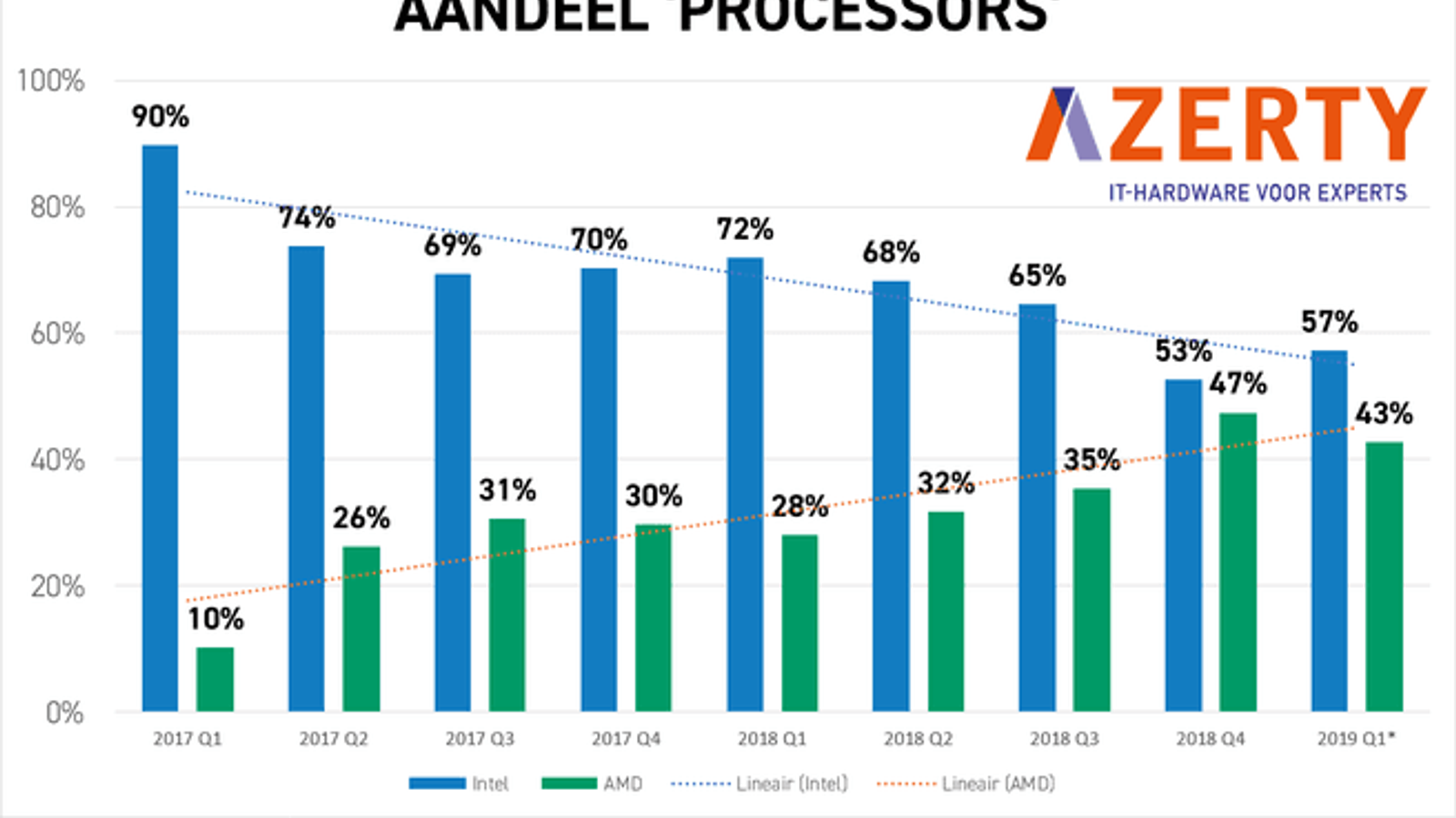 Диаграмма выше предоставлена компанией Azerty и отображает продажи в странах Бенилюкса (Бельгия, Люксембург и Нидерланды). Как можно видеть, в этих странах AMD не обошла Intel по продажам процессоров, но за два года сократила разрыв до минимального.