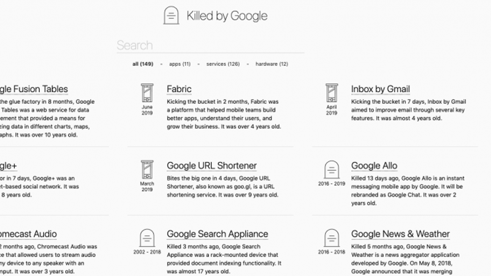 Сайт с открытым исходным кодом содержит в общей сложности 149 подобных продуктов Google: 129 сервисов, 11 приложений и 12 аппаратных продуктов. Для компании с 20-летней историей выходит, что в среднем ежегодно Google «хоронила» по 7 продуктов.