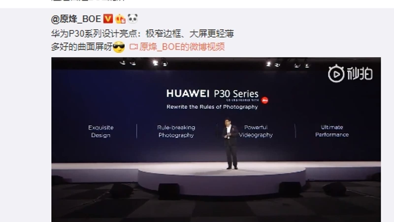 После вчерашней премьеры смартфонов вице-президент BOE поинтересовался у пользователей социальной сети Weibo, насколько им нравится изогнутый дисплей в Huawei P30 Pro. В общем-то, больше можно было и ничего не говорить: весьма сомнительно, чтобы топ-менеджер стал бы интересоваться экраном конкурента.
