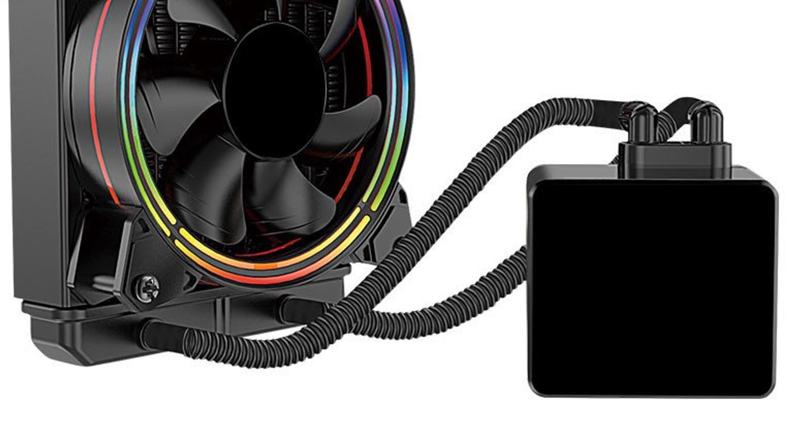 Конфигурация СЖО также включает водоблок, совмещенный с помпой. Этот модуль имеет прямоугольную форму. Шланги, связывающие его с радиатором, заключены в черную нейлоновую оплетку.