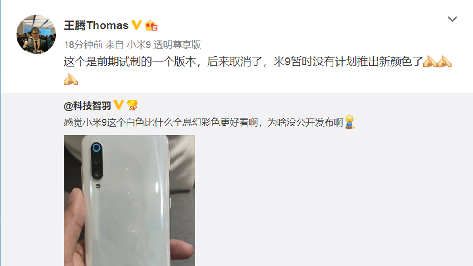 Глава отдела новой продукции Xiaomi Ван Тен (Wang Teng) опубликовал в социальной сети Weibo фото отмененной версии Mi 9 – в белом цвете. По словам топ-менеджера, в белом цвете был выполнен прототип смартфона, который впоследствии по каким-то причинам не пустили в серию. Он же сообщил, что у компании нет планов выводить на рынок новые цвета для своего флагмана.