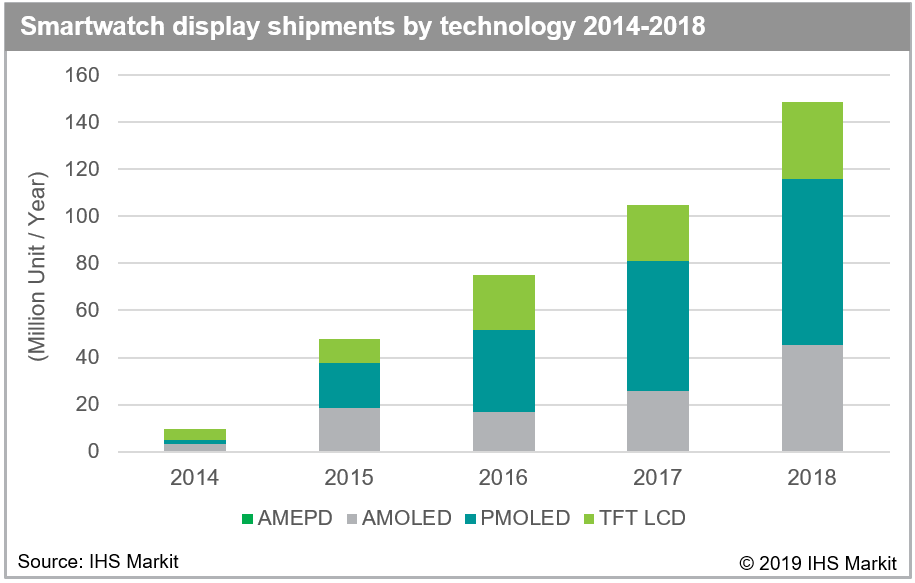 Рынок умных часов уверенно растёт уже много кварталов подряд. Поэтому неудивительно, что аналитики IHS Markit отметили существенный рост поставок экранов для данного класса устройств в прошлом году.