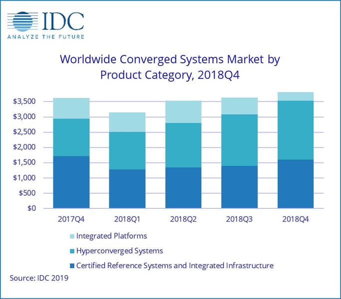 Специалисты аналитической компании IDC подвели итоги четвертого квартала 2018 года на рынке конвергентных систем. Согласно их подсчетам, указанный рынок в годовом исчислении вырос на 14,8%. В четвертом квартале 2018 года он достиг 4,15 млрд долларов.