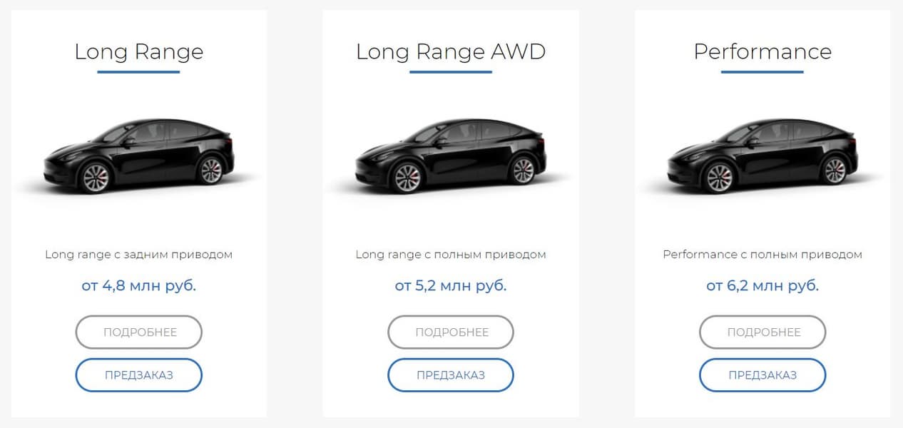 Для брони пока доступны три модификации: Long Range с задним приводом по цене от 4,8 миллиона рублей, та же Long Range, но уже с полным приводом (от 5,2 миллиона рублей) и Performance с полным приводом (от 6,2 миллиона рублей). В 2021 году должна поступить Tesla Model Y Standart по цене, ориентировочно, 4 миллиона рублей.