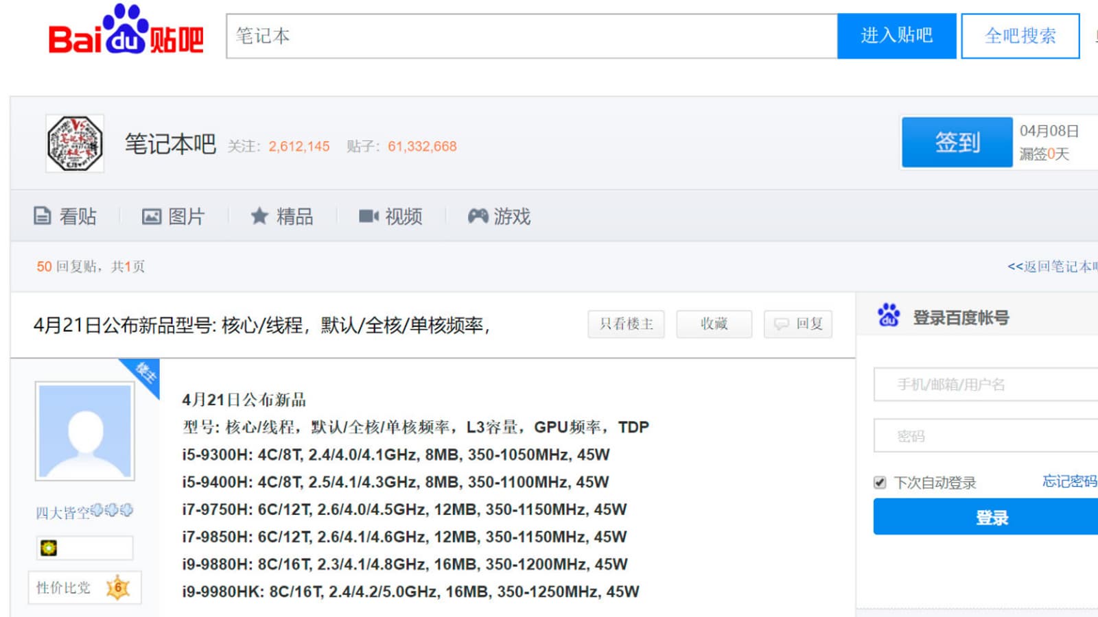Компания Intel формально анонсировала процессоры Core H девятого поколения для ноутбуков во второй половине марта. Несмотря на данное в тот же день обещание выпустить процессоры во втором квартале, характеристики их пока официально не сообщаются. Что ж, если Intel сама не может их раскрыть, то за нее это делают китайцы.