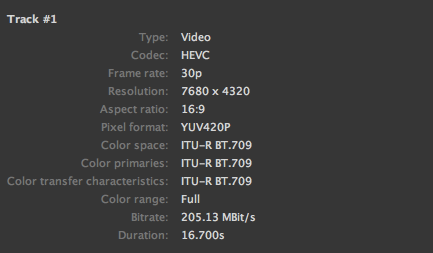 Запись видео осуществляется в разрешении 7680 х 4320 пикселей и кадровой частотой 30 к/с со сжатием по стандарту H.265 и скоростью потока 200 Мбит/с.