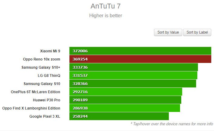 Следующий график показывает, что Oppo Reno 10X Zoom лишь немного уступил смартфону Xiaomi Mi 9, зато опередил такие флагманы, как Samsung Galaxy S10 и S10+, а также Huawei P30 Pro.